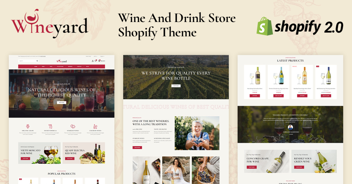 Wineyard is an elegant and professionally crafted Shopify 2.0 responsive theme designed for vineyards, wine shops, liquor stores, and premium beverage retailers. With a clean and sophisticated layout, Wineyard captures the essence of luxury and tradition, making it the perfect choice for showcasing wines, champagnes, spirits, and gourmet products in a visually appealing way.