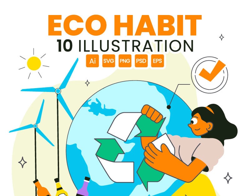 Eco Habit Illustration Featuring People Sorting Waste, Using Eco Bags, and Reusable Cups for Zero Waste and Sustainable Living in a Lifestyle Theme Suitable for Poster, Web Banner, Brochure, Landing Page and Others Background Template Features: