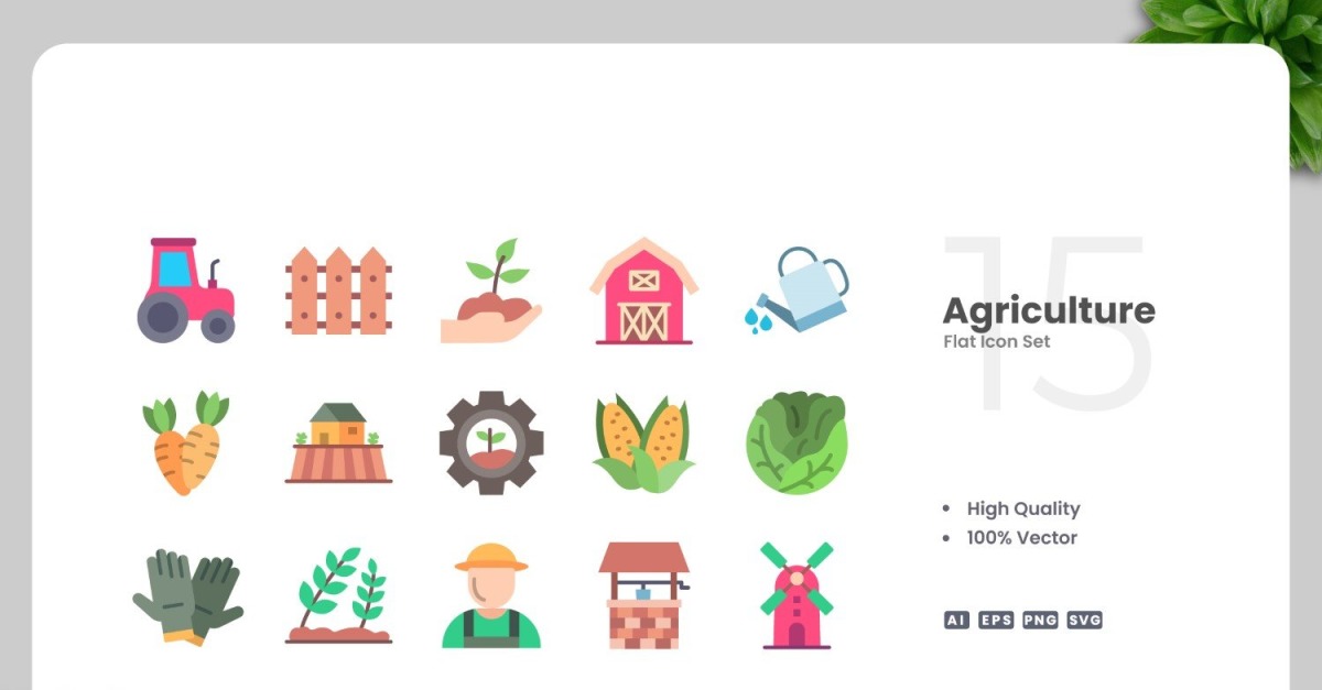 Set of 15 Agriculture flat icons | Simple and clean design, perfect for websites, mobile apps, books, social media, infographics, flyer, print, banners, posters and many more. To resize or change color you can easily edit on vector software like Adobe Illustrator and CorelDRAW.