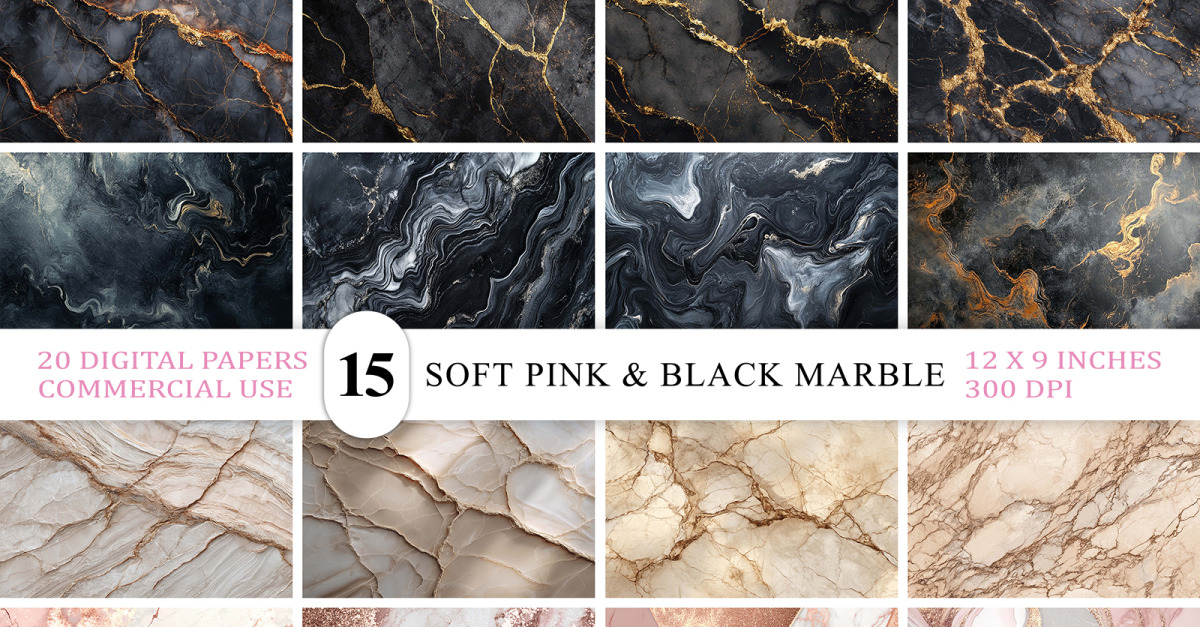 This pack includes 20 Soft Pink and Black Marble Texture Bundle digital papers/backgrounds.