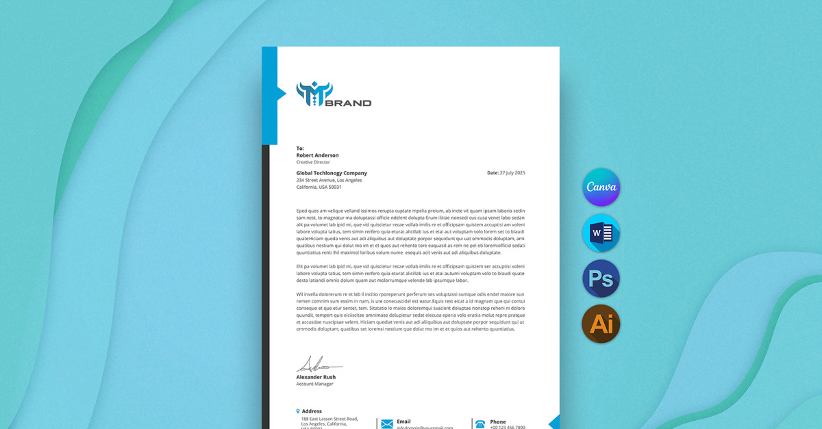 A professionally designed letterhead template.Canva file (edit right from your web browser at the Canva site. No software is required).MS Word file (.docx for editing in MS Word).Adobe Illustrator file (.ai for editing in Illustrator).Adobe Photoshop file (.psd for editing in Photoshop).A list of free fonts used in the template + download links.Step-by-step text and visual PDF instruction guide.Fast and friendly after-sale customer support.