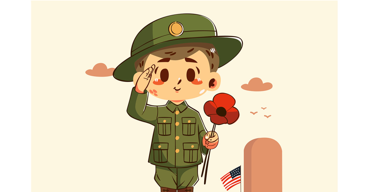 **A young soldier in uniform saluting while holding a poppy flower, suitable for commemorative designs**