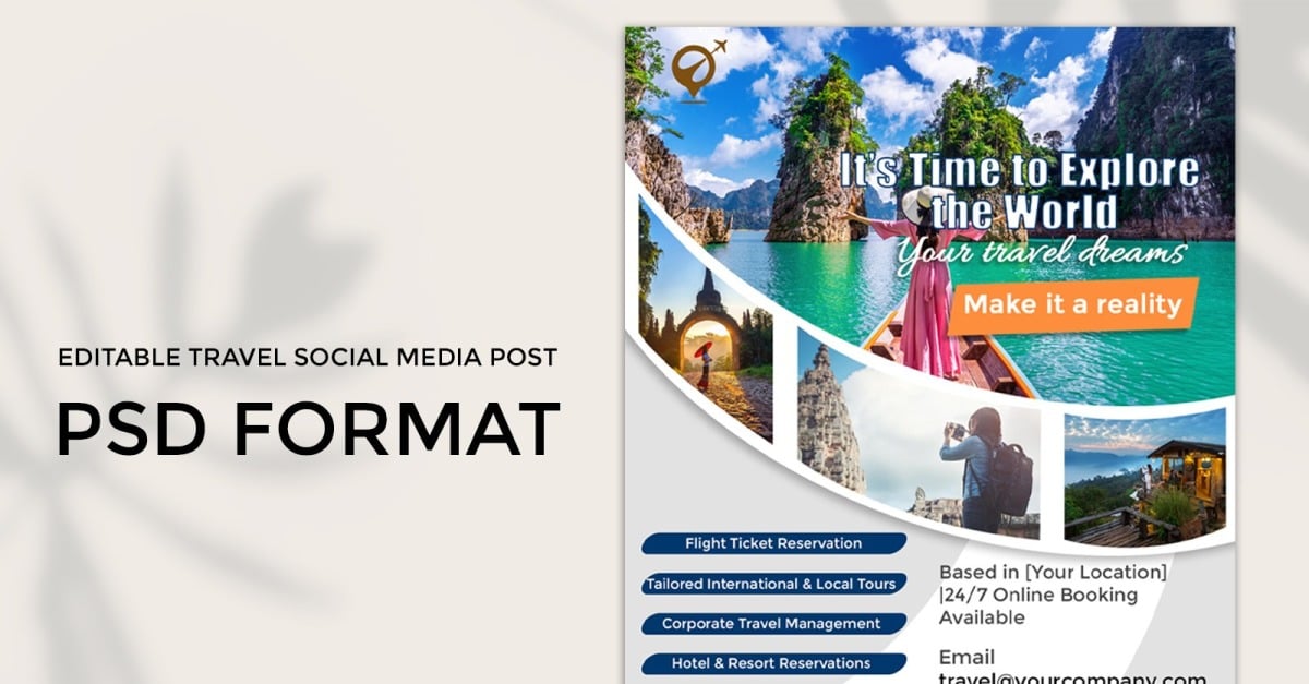 The flyer is ideal for promoting international and local tours, retreats, flight bookings, hotel reservations, and travel consultations. Fully editable in Photoshop with well-organized layers, smart objects, and free fonts. The design includes an attractive headline, strong call-to-action button, and clear contact info placement to drive conversions.