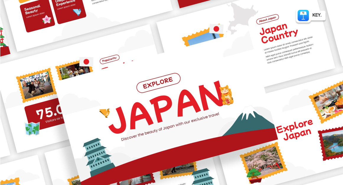 Elevate your presentations with the “Explore Japan” Keynote template. With 20 professionally designed slides, full animations, and easy editing capabilities, this template empowers you to create captivating and impactful presentations effortlessly. Impress your audience, deliver your message with style, and make a lasting impact. Download now and take your presentations to new heights!