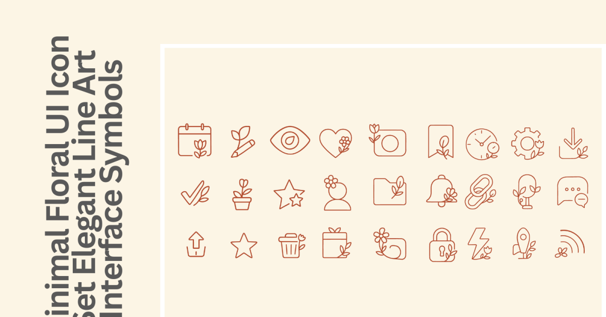 Modern and minimalist floral icon collection featuring UI elements like calendar, folder, heart, star, upload, trash, settings, lock, and message icons — all decorated with simple floral accents. Perfect for Canva kits, feminine branding, and user interface design packs.