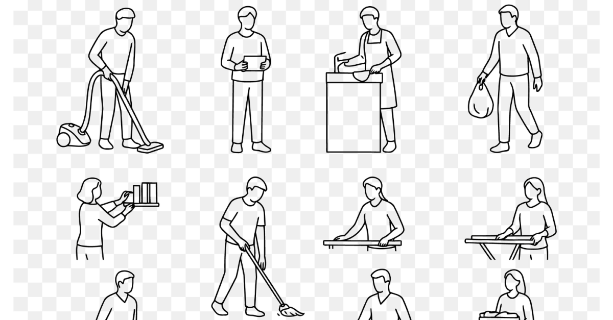 clean and practical black line art set featuring faceless, handless characters performing everyday home chores. Activities include vacuuming, ironing, washing dishes, organizing books, taking out trash, mopping, and doing laundry. Ideal for use in printable planners, home management kits, lifestyle blogs, cleaning apps, and commercial vector packs. Optimized for microstock platforms.