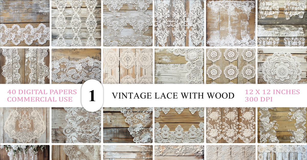 40 Vintage Lace Overlay With Rustic Wood Digital Paper Bundle | Premium Quality | Commercial Use Ready