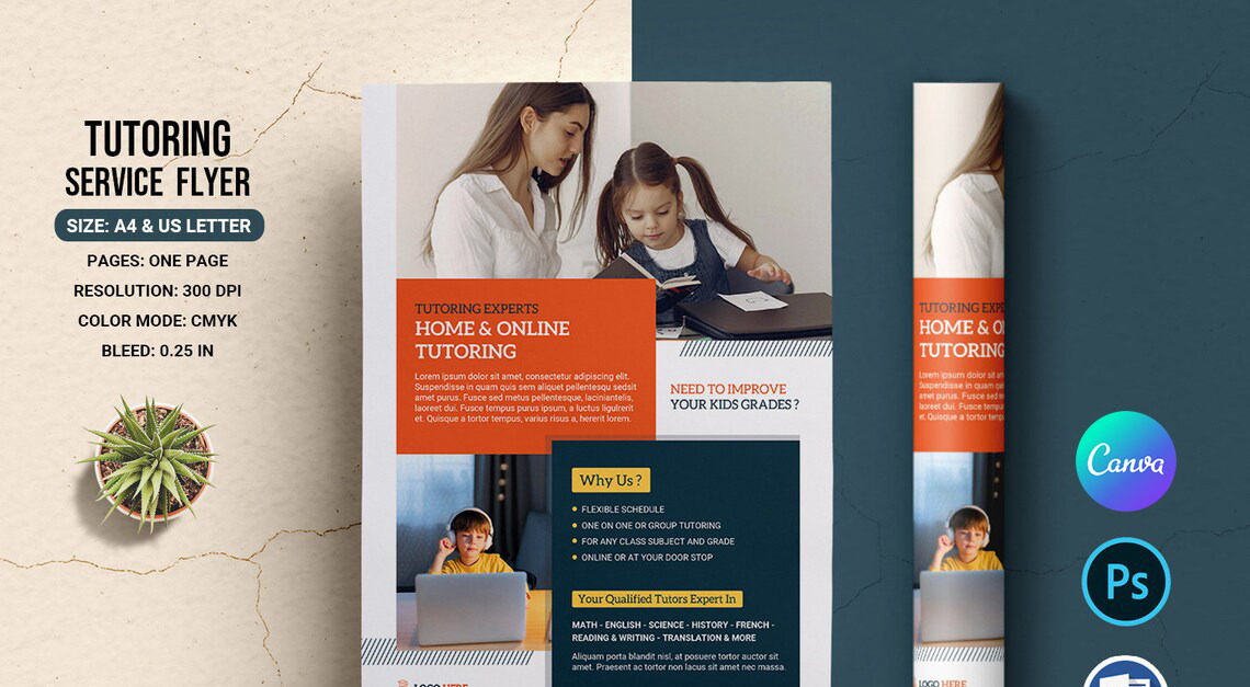 Tutoring Service Flyer Template. All object is in separate layer, grouped and named. Easy to edit, smart object used, easy to replace photo here.