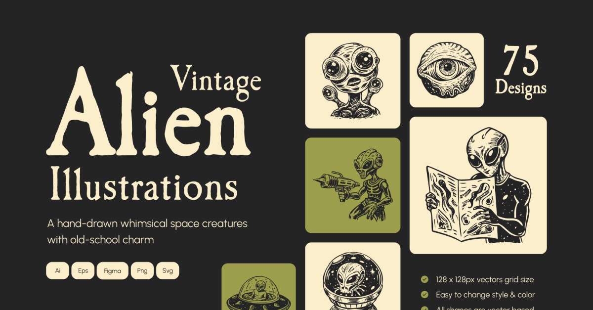 Includes AI, EPS, SVG, PNG, JPG, and Figma formatsTransparent PNGs (256–2048px)Vintage retro sci-fi art styleUnique alien characters, creatures, spaceships, planets, and alien weaponsScalable for print and digital projectsReady-to-use for merch, branding, or postersPerfect for designers, illustrators, and creators